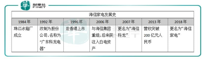 正值彩电、电风扇等电器的家电行业萌芽之时,海信家电的前身珠江冰箱厂于1984年在广东顺德成立。于1992年改制为股份公司,全名为“海信科龙电器股份有限公司”。受益于中国市场带来家电行业的高速发展,海信家电在1996年成功赴港上市,证券简称为“广东科龙电器股份”,1999年成功在深交所A股上市。