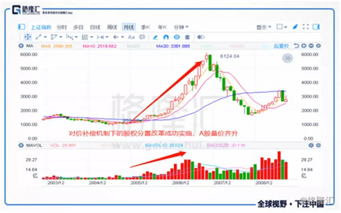 2005年的股权分制改革有了对价补偿机制之后,推行获得成功,也引发了2006年之后A股市场的一波指数涨幅超波澜壮阔的大牛市。