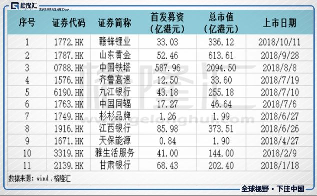 从融资功能看,2018年至今,港股市场共有11家公司以H股身份上市,其中,体量最大的中国铁塔(0788.HK)首发上市募资587.96亿港元,创2年来H股首发募资之最。(2016年9月邮储银行上市首发募资591.5亿港元)。