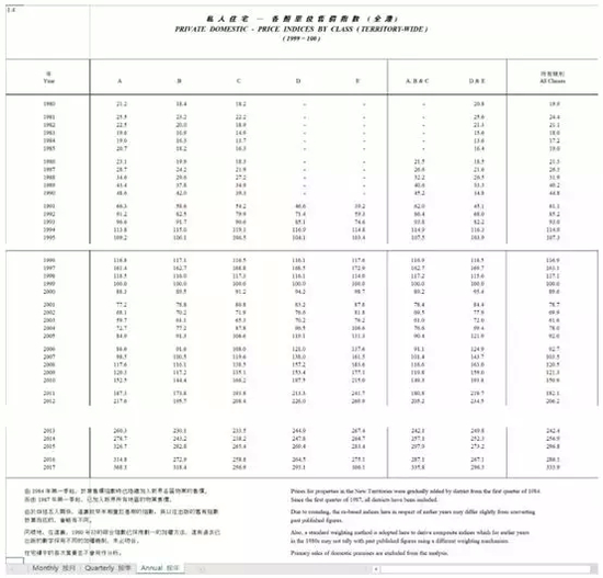 1980-1997年之前总体为上升阶段,80年代初因石油危机导致的世界经济危机使得头三年房价下跌在1984年私人住宅售价指数达到一个历史低点17.2,而之后则出现一个较长的房价上升期,有7个年份涨幅超过20%,其间3个年份涨幅超过36%(出现在1990年代:1991年涨幅36.4%、1992年39.4%、1997年39.5%),1997年相比1985年,香港私人住宅价格指数暴增七倍,房价涨幅超过了上世纪80年代的日本。