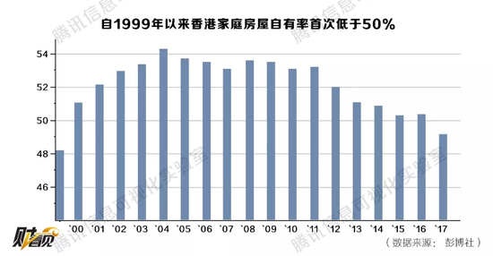 在香港,有房一族已不再是多数,根据香港政府统计处发布的数据,截至2017年底,只有49.2%的香港本地家庭拥有所居住房屋的所有权,这个数字已经达到1999年以来的最低水平,该比例在2004年时曾经达到54.3%(下图)。