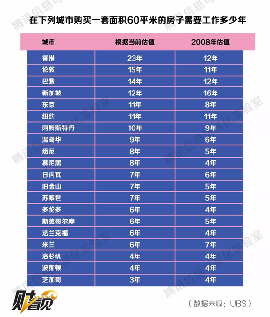 据瑞银研究,香港房价泡沫聚集速度明显快于其他城市,之后是慕尼黑和多伦多,以房价收入比为指标,2008 年在香港市区买一套 60平方米的房子要攒12年薪水,今年已经涨到 22 年,如果去掉房子面积和购买地点的限制,全港房价收入比达到 46 倍。