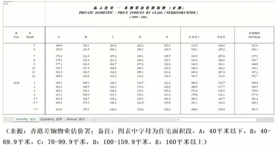 从较近的历史来看,香港房价经历过几个波动的周期,从1980年到2018年的38年间有四次较为明显的波动, 1981年—1984年为跌、1985年—1997年为升、1998年—2003年为跌、2004至今的最长上涨期。(下表为香港1980-2018年7月“私人住宅售价指数”历史记录, 2018年数据为1-7月的逐月数据。)