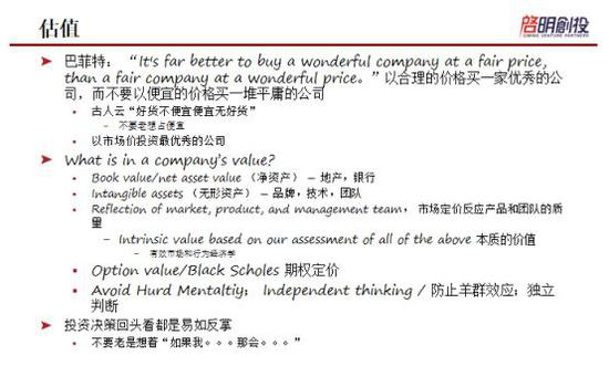 所以,所有的市场定价都反映了产品团队,我认为在一个有效的自由的市场里,所有的信息都应该反映在股价里了。我们作为职业投资人的工作就是寻找这个价值和真实情况不太吻合的一些投资机会,但是要寻找这样的机会挺难的,所以我建议大家还是分散风险,买些指数就算了,不要老是做调研等等,因为这个时代要找到无形资产实在是太难了。