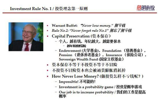 “风险边际”说起来倒是挺专业的,但大家知道巴菲特是怎么说的吗?他说投资第一条原则就是“别亏钱”,第二条原则就是牢记第一条原则。所以做投资,在座的有很多是家庭比较富裕的,其实仔细想一想,在现在中国的社会,如果你每天吃喝玩乐泡酒吧和逛夜总可能也会花不了多少钱,但是你一投资,尤其是在现在这么险恶的市场环境中,一不小心就可能一晚上把你很多钱都亏了,泡酒吧喝拉菲的钱跟投资亏损的钱简直是小巫见大巫。所以,资本保存是投资的第一个原则。一个人越有钱,年纪越大,就越倾向保本,但是反过来讲又有点矛盾,如果年轻就应该多冒一点险,因为未来对于他们来说还很遥远。