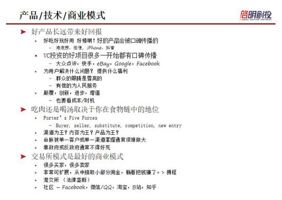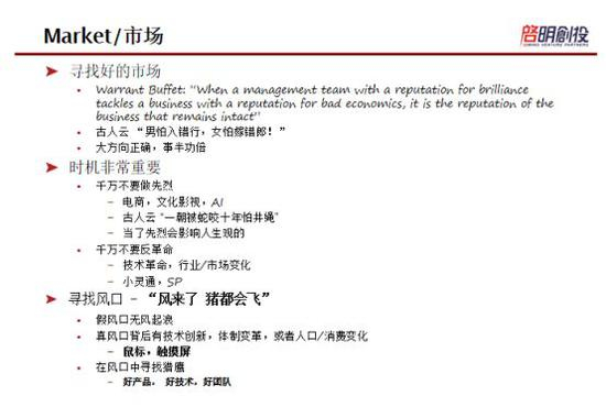 有一句话说“风来了,猪都会飞”。的确是,十五年至二十年前我们投一些重工业公司比如水泥、钢铁那段时间你会赚的很好,再往前十五年投一些房地产公司基本上都会赚钱,在过去的几年中,因为有了移动互联网,很多移动互联网公司也非常成功。不过,风口中难免会掺杂一些假的风口,那什么是真的风口呢?真正的风口背后都有技术的革新,体制的变化,有人口和消费的变化,所以我们需要寻找一个真正的风口,同时在风口中不能只投猪,也可以投,也能赚钱,但是最终要投到一个猎鹰,能够跟着风飞的更久更远,哪怕风停了,猎鹰还可以飞,猪会掉下来。