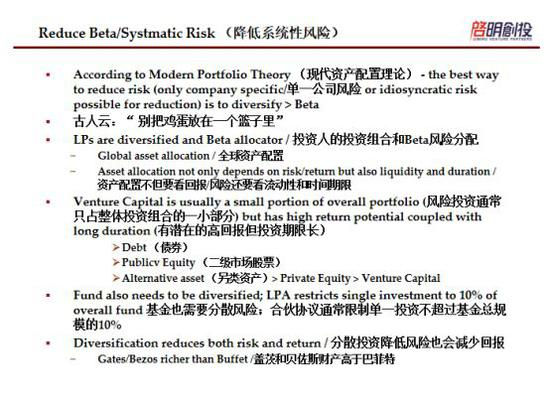另外,所有的基金也都需要做资产配置,从大学基金或者退休养老基金,他们主要的资产会是在这些债券上,因为债券的风险相对来说是比较低的。而且在债券里的资产多数是美国国债,相对来讲,美国国债在金融里会被列为是无风险的资产,然后再配置一部分到二级市场,最后再有一部分做另类资产,另类资产中又包括对冲基金、私募基金以及包括我所从事的VC行业。