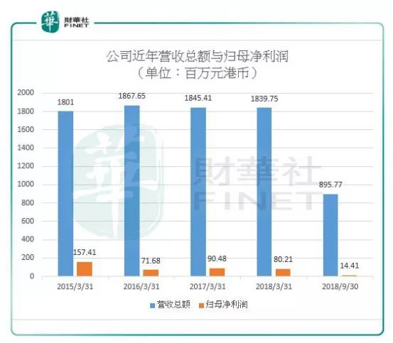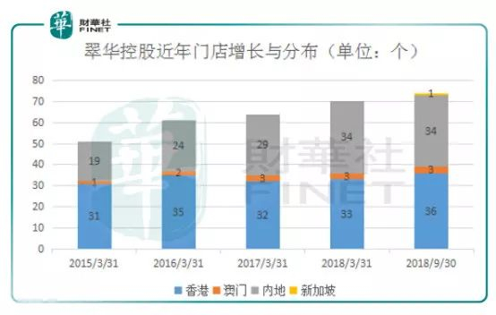 数据显示,公司自2015年财年以来,营业收入总额维持在18亿水准之上,净利润从1.57亿元港币,跌落至2018年财年的8021万元港币。同期,公司的门店数量从51家增至70家。公司呈现出增店不增收,增店狂降利的窘状。