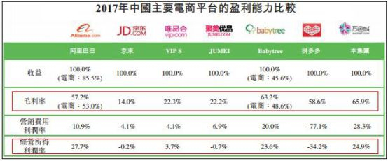 众所周知,传统电商一般在发展的前期需要投入大额资金,并且主要依赖流量覆盖,是薄利多销的盈利形式,因此基本上会有较长的一段亏损时期;而以万色城为代表的社交电商平台之所以普遍盈利能力较强,很重要的一个原因就是其毛利率水平相对较高。万色城招股书资料显示,2017年其毛利率水平在中国主要电商平台中居于高位,并且盈利能力也占据明显优势: