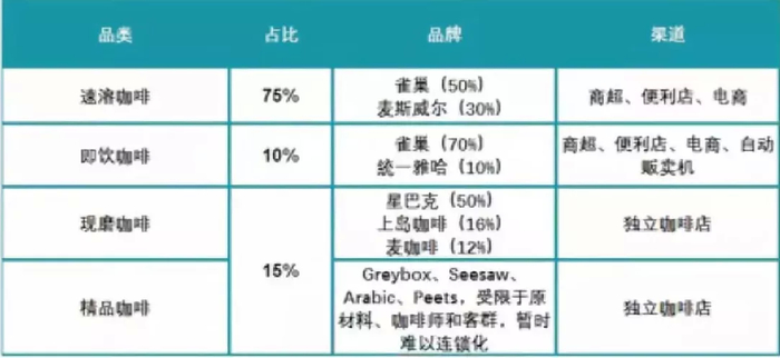 而且另一个需要重视的事实是,速溶咖啡在中国依然有大量的拥趸。从咖啡消费量的比例构成看,中国速溶咖啡占据75%的市场份额,现磨咖啡仅占15%。全球范围内,现磨咖啡在咖啡总消费量中的占比则超过了87%。