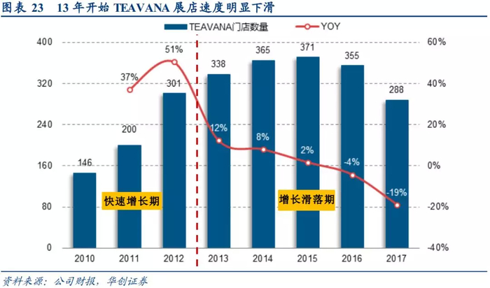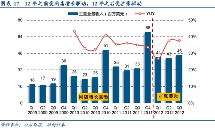 2012年之前TEAVANA业绩受同店增长驱动,之后受扩张驱动。TEAVANA的成长可以分成两个阶段,在2012年之前,店铺数量增长相对缓慢,业绩主要受同店销售增加而驱动;2012年之后,同店销售额增长放缓,而扩张速度明显加快,业绩受规模扩张驱动。