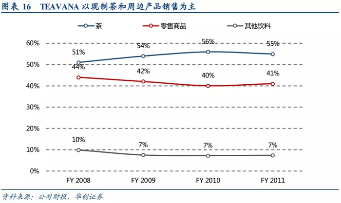 从营收结构看,TEAVANA以现制茶饮料和周边产品为主。TEAVANA的主要业务包括现制茶饮料、茶叶和茶具等周边产品以及其他饮料和食品。在被星巴克收购之前,其现制茶饮料的营收占比超过50%,且有逐年提高的趋势,其次是周边产品销售,占比超过40%。