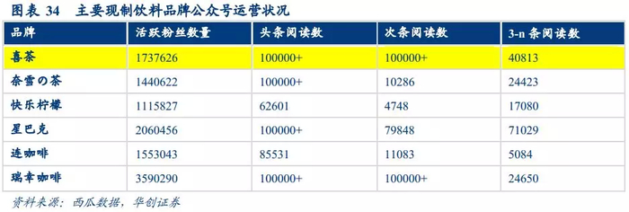 喜茶公众号运营能力一流,看齐星巴克和瑞幸咖啡。根据西瓜数据的监测,喜茶公众号的预计活跃粉丝数量高达1737626人,仅落后于以品牌推广为傲的瑞幸咖啡和老大哥星巴克,甚至高于以社交裂变著称的连咖啡。从文章阅读数量来看,喜茶更是佼佼者,大幅领先于其他奶茶品牌。这些都从各个角度证明了喜茶的粉丝数量和其活跃程度,彰显了喜茶品牌运营的成功。