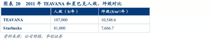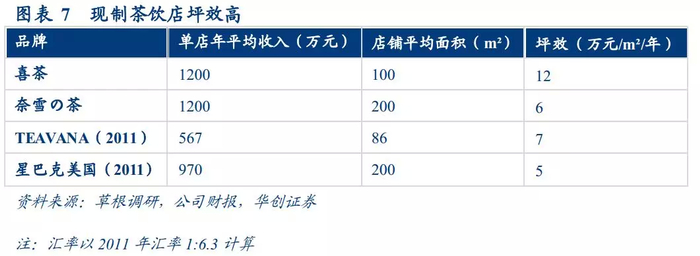 现制茶饮周转快、以外带为主,坪效高。根据我们的草根调研和公开信息推算,以喜茶和奈雪の茶为例,一线城市典型店面的单店月收入均超过1200万元,假设经营面积分别为100和200平米,则坪效分别大约为12万元/m²/年和6万元/m²/年,远超普通餐饮、零售行业坪效,比肩顶级餐饮企业坪效水平(海底捞5-6万,一线城市6-8万)。此外,根据2011年TEAVANA的财报数据,其坪效也高于同时期的美国星巴克门店水平。