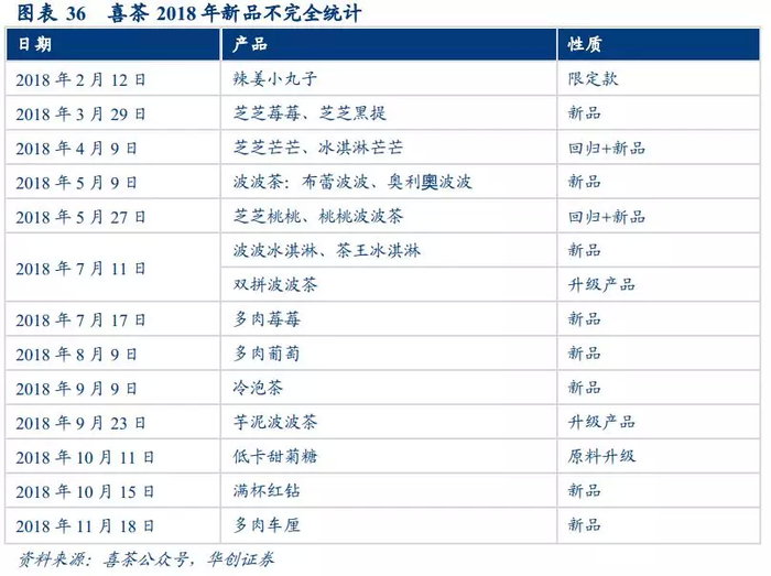18年喜茶平均每月推出2款新品,时刻保持吸引力。根据喜茶微信公众号的信息,2018年喜茶一共发布了48款新品,平均每月发布2款新品。其新品种,不仅包括新的产品类型,也有季节限定款,旧产品升级,口味改良,原材料升级等。强大的新品推出能力让消费者在喜茶总可以发现新的目标,从而使喜茶保持了长久的新鲜感和吸引力,以适应消费者不断变化的口感和可能出现的厌烦感。