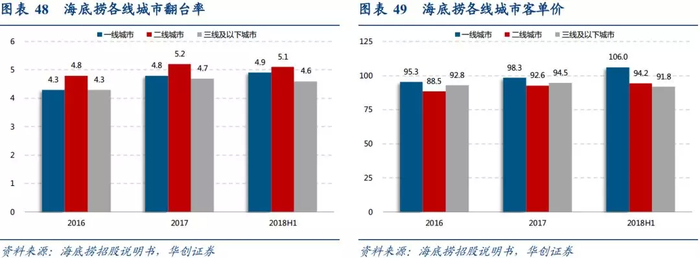 海底捞渠道下沉获得成功,新茶饮品牌发展空间值得期待。海底捞客单价高达90元以上,在火锅品牌中价格偏高。但是海底捞在三线及以下城市仍然保持了良好的经营效率,翻台率和客单价均和一二线城市差别不大。结合目前消费升级的整体趋势和三线以下城市人均可支配收入的提高,新茶饮品牌的发展空间值得期待。