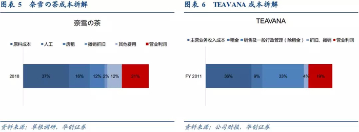 现制茶饮的原材料简单,毛利率水平高达60%以上。根据草根调研和估算,奈雪の茶毛利率约为63%,营业利润率为21%;美国TEAVANA的公司财报显示其盈利能力也在同一水平线上。尽管奈雪の茶拥有国内奶茶店最高的价格水平,但是水果茶的物料成本相对于普通台湾奶茶/港式奶茶更高,推测其他奶茶品牌的毛利率有望超过70%,甚至达到80%。