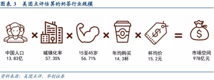 现制茶饮和咖啡一样,都因含有咖啡因而具有一定的成瘾性。现制茶饮因为加入了牛奶、糖等配料,口感上更偏甜和醇厚,其味觉记忆较浅,不容易使人产生厌烦感。此外,经过十多年的发展,现制茶饮获得了大批忠实的女性受众,成为在逛街、休闲娱乐时的首选。这些特性使得现制茶饮成为了贴合文化特质、潜在顾客群体庞大且回购率高的单品,根据美团点评发布的《2017年我国饮品店发展报告》的估算,我国现制奶茶行业潜在规模接近1000亿元。