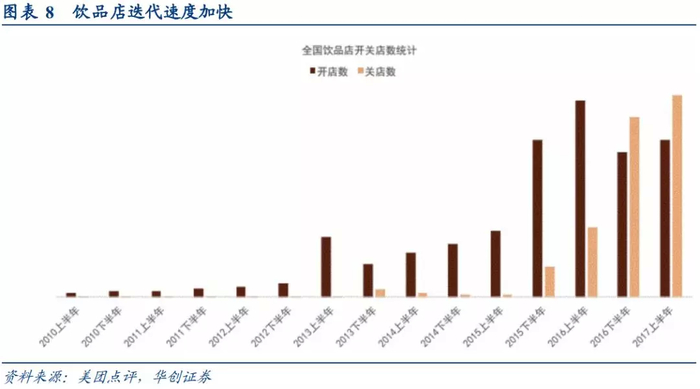 现制茶饮行业因为门槛低,同质化严重,关店率较高。我国现制茶饮店在新增店铺快速增长的同时,也有大量的店铺在选择关闭。根据美团点评的数据显示,自2016年下半年开始饮品店显著超过开店数量,2017年上半年饮品店关店数量更是开店数量的1.3倍。