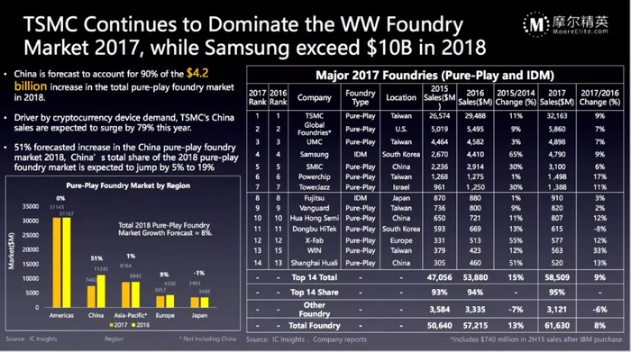 2017年,晶圆代工市场最大的公司是台积电,大概占了整个行业的52%,营收达到了320多亿美金,全行业产值约为616亿美金。2018年,代工产业增长得很快,整体产值增长了超过42亿美金,增长率约为9%。其中90%的增长来自于中国市场,预计这个数字在未来几年仍然会保持非常高,甚至可能超过100%,也就意味着除了中国市场之外的晶圆代工产值在下降,整个的芯片设计产业在向中国集聚,因为芯片设计产业是晶圆代工厂的客户,随着客户量增加,晶圆代工的销售额也会不断地上升。