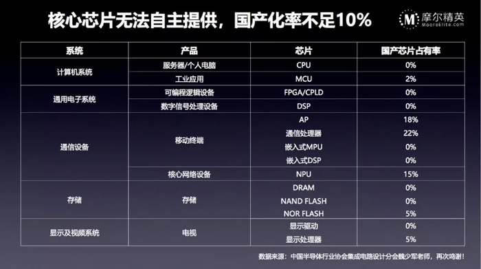 中国芯片自主提供的比例非常低,除了通信设备里因为海思和紫光展锐两个大公司存在有超过10%的比例之外,其他领域的自给率都非常的低,甚至很多的领域都是接近0%,这是一个触目惊心的数字。