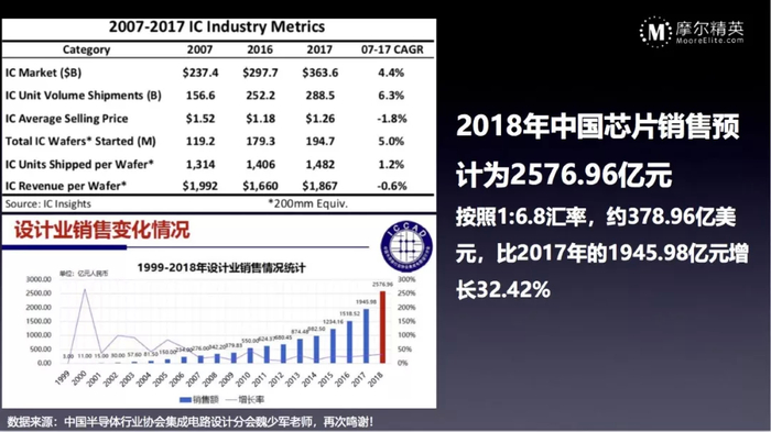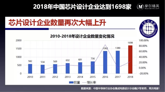 中国国内的芯片设计行业也在不断地追赶,从过去的二十年来看,成长的速度是非常快的,年复合增长速度超过40%,2018年的成长速度也达到了32%,因为基数太小了,所以一直到去年都是高速增长,现在的市场规模也就是380亿美金左右。相较于2007-2017年全球芯片市场4.4%的增长率,中国芯片市场的增长率一直在维持在30%以上,众多研究机构预测这样的增长率还会再持续5-10年。