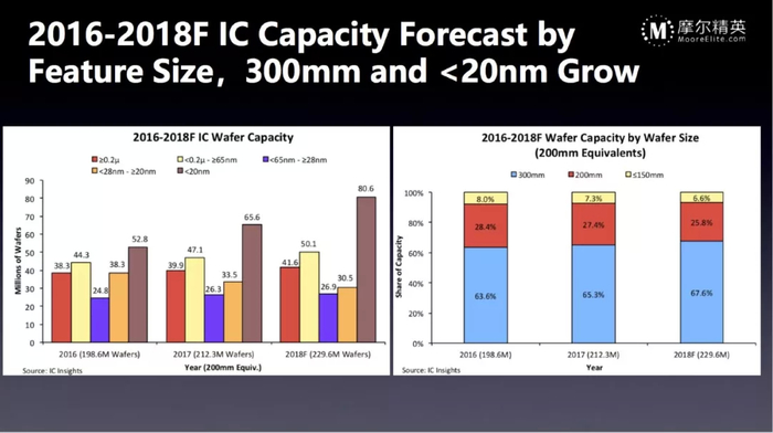 从全球晶圆代工的出货情况看,全球每年大概销售2亿张等效8吋晶圆。其中,落后节点和成熟节点基本已经稳定,不断在增长的是20纳米以下的先进节点,从6吋、8吋、12吋晶圆的分布来看,12吋的比例越来越高。