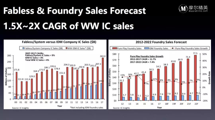 Fabless模式其实是在1987年台积电成立以后才开始发扬光大,光刻机这样的生产设施让Fabless公司的活力被激发出来。过去三十年中只有两三年Fabless公司的成长速度是低于整个产业的,而且更多是因为涨价等额外因素干扰,其他大部分的时间里,Fabless公司的成长更快,这就是为什么这么多优秀的人才投入到了Fabless公司当中。我们提到过晶圆代工的增长比较快,9%左右的增长速度和Fabless公司的增长速度类似,因为它们几乎是完全同步的。当Fabless公司销售上升时,自然需要给晶圆代工下更多的订单,所以这两个领域的成长在过去十年左右的时间里都更快,而且未来增速仍然会保持在整个半导体产业增速的两倍左右。回顾一下之前的几个数字:全球的GDP增速大概是2%左右;全球的半导体增速大概是4%左右;Foundry和Fabless的增速大概是9%左右。