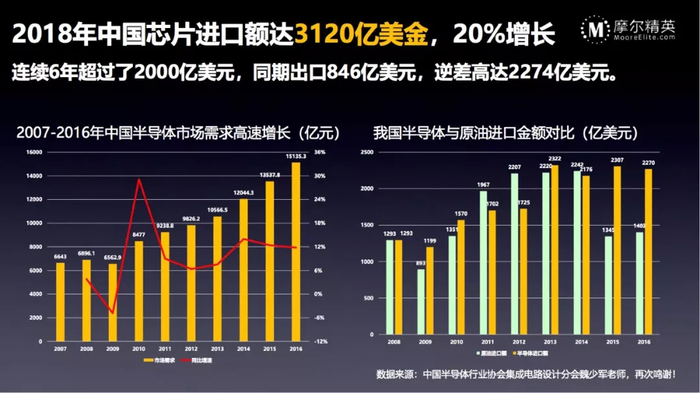 2018年,中国进口3121亿美金的芯片,而全球的市场总额也就是4700亿美金,中国进口了大概2/3,算上出口的846亿美金,逆差高达2274亿美金。而且,这已经是中国连续六年进口半导体超过2000亿美金,这是一个巨大的市场机会,这就是为什么各种投资都在往中国涌入。