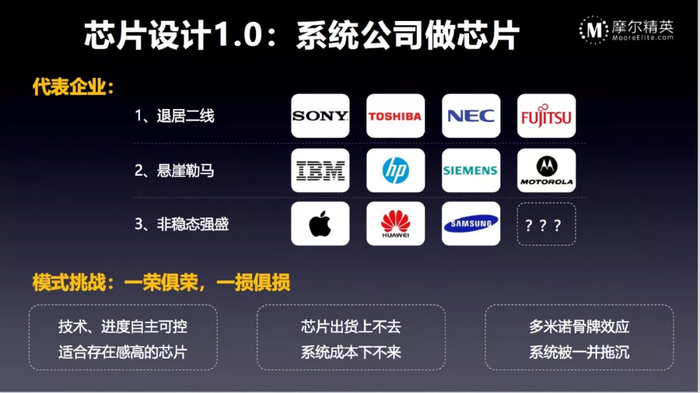 最早出现出现的芯片设计都是诞生在系统公司,因为内部产品需要,所以自己定义和设计芯片。这个模式的好处很明显,内部需求明确,芯片研发出来就有市场,内部合作信任度高,芯片和系统协作,性能容易提升。