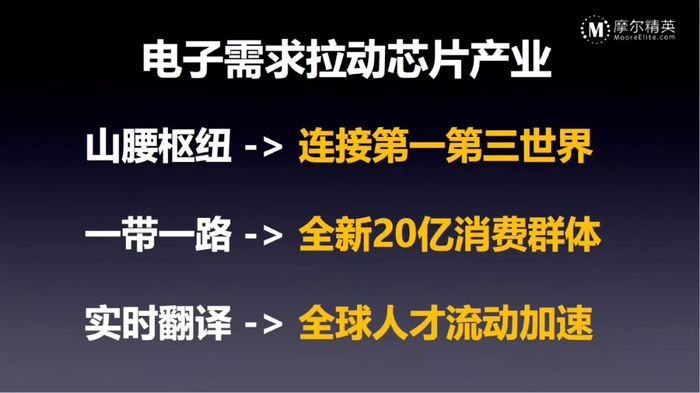 第一是中国现在扮演着一个山腰枢纽的地位,连接着第一世界发达国家和第三世界,大量的电子产品的制造是在中国完成的,虽然iPhone的设计是在美国,但是绝大多数是在中国生产出来,然后再销往全球各地。以后,大量的电子设备如智能汽车都会在中国进行这样的生产,这是巨大的机会,对中国的芯片产业来说是近水楼台先得月。