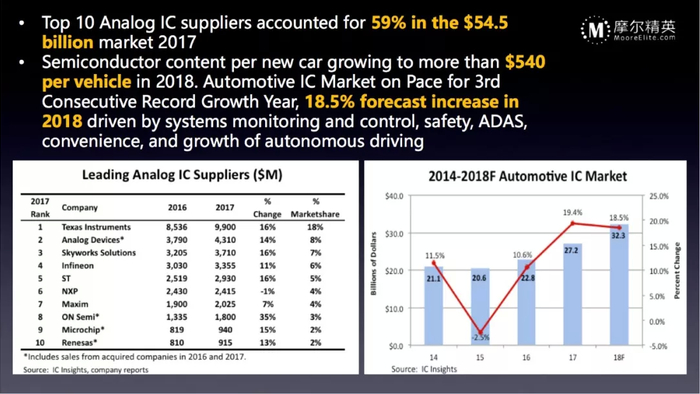 半导体里面有很多的细分,包括存储器、数字芯片、通信芯片等。目前创业非常火热的几个领域,首先是模拟,模拟的全球市场约为500多亿美金,也是一个头部效应非常集中的领域,前10大公司占了59%,但不同于数字芯片的集中,一款数字芯片的销售额是10亿美金甚至更高的收入,小公司很难去竞争。模拟芯片领域的德州仪器有100多亿美金的营收,但这个收入是由几千甚至是几万种产品合在一起拼出来的,相对而言,细分领域创业的成功率会更高,模拟的特点就是一个碎片化、小而全的市场。然后是汽车,汽车芯片是最近几年增长非常快,未来也会非常火热的市场。2018年汽车芯片产业增长率约为18%,过去几年都在10%以上,年复合增长率在15%左右。现在每辆车的半导体芯片成本大概要540美金,这个数字还会不断地上升。今年的CES上汽车电子的内容越来越多,芯片厂商、传统车厂、新兴车厂包括家电厂商都在努力挤进这个市场。确实,未来对无人驾驶电动汽车的想象空间非常大,需要的电子芯片部件会越来越多,有数据显示其数量可以达到3-5倍以上。不光是整车的数量在增长,每个车里面的电子零部件的数量同样也在增长。