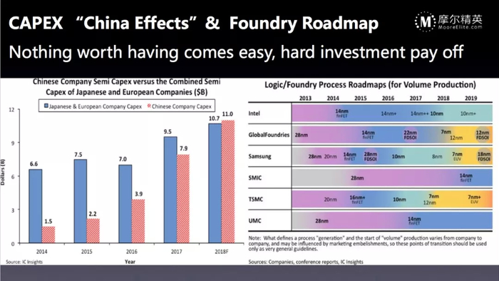 投资这么大,厂商得到了什么呢?投资多的公司,如英特尔、三星、台积电的工艺发展速度非常快,投资少的公司自然开发进度就会慢,想追上这些先进的工艺并不容易。当前中国半导体的资本支出已经等于欧洲、日本的总和。2014年,中国半导体资本支出大概不到它们的1/4。四年后的2018年,中国的支出已经超过了欧洲和日本的总和。所以,中国半导体的投资速度在增长,整个产业也在进行转移。