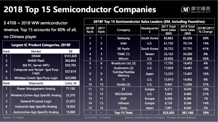 我们看一下全球前15大半导体公司,其中最大的半导体厂商三星在整个销售额中占比约为20%,2018年的产值预计为800多亿美金,第2名英特尔约为700亿美金。英特尔占据半导体榜首的位置大概二三十年的时间,直到2017年才被三星超过,2018年由于内存涨价的原因英特尔落后三星比较多。