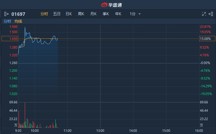 山东国信(01697)早盘快速拉升后,涨幅收窄,截至10时41分,涨15.08%,报1.45港元,成交额达716.4万港元。