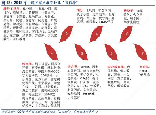 根据网经社旗下电子商务研究中心发布《2018年中国互联网教育行业“百强榜”》。榜单由综合类、语言类、数学类、IT类、音乐类、职业技能类、辅导工具类等7个类目共100家平台。