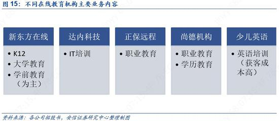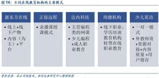 新东方在线是线下培训机构转向线上+线下的产物,背靠新东方集团线下培训,这决定了公司整体在内容端和客源端已经具备相应的基础;尚德机构是线下职业、学历培训教育机构转型在线职业教育,定位大班直播课;达内科技主营编程类的网课;无忧英语则主营1对多的在线外教课,目前在探索小班课;正保远程教育采用录播课授课模式。