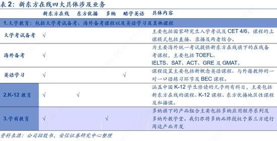 业务:旗下有新东方在线、东方优播、多纳和酷学英语四大平台,锁定大学教育、K-12教育及学前教育三大核心领域。