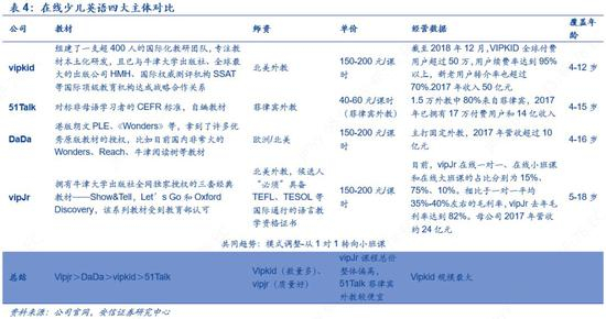 根据公司官网, VIPKID采用自编教材,组建了一支超400人的国际化教研团队,专注教材本土化研发,且已与牛津大学出版社、全球最大的出版公司HMH、国际权威测评机构SSAT等国际顶级教育机构达成战略合作关系。DaDa拿到许多优秀原版教材的授权,比如目前国内非常火的Wonders、Reach、牛津阅读树等教材。51Talk对标非母语学习者的CEFR标准、自编教材。vipJr拥有牛津大学出版社全网独家授权的三套经典教材——Show&Tell,Let’s Go和Oxford Discovery,该系列教材受到教育部认可。在适应性与教材质量上看,Vipjr>DaDa>vipkid>51Talk。