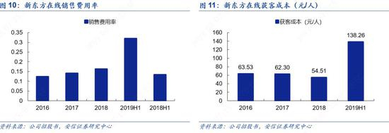 线上媒体推广是新东方在线长期以来最主要的营销渠道,平均获客成本上升至138元。大学及K12分部的线上媒体推广活动增加和广告费上升,2019财年半年公司销售费用率上升至31.94%;新东方在线的平均获客成本由上年同期的55元增加至138元。