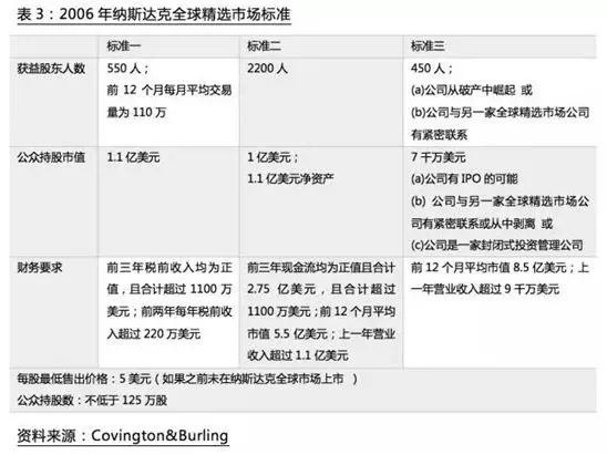 2006年7月,纳斯达克全国市场被划分为两层,即纳斯达克全球市场和纳斯达克全球精选市场。其中纳斯达克全球精选市场的上市标准基本照搬了纽交所当时的上市要求,对市值、流动性和收益提出了要求,但门槛值略高于纽交所,综合来看成为全球最高的挂牌标准。
