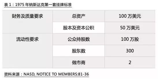 1975年,纳斯达克提出了挂牌标准,在企业公共股东、盈利能力和市值三个方面提出了要求,只要达到标准就可以申请在纳斯达克挂牌交易。其目的就是避免过多不具备融资资质的企业上市给投资者带来风险。同时纳斯达克规定只有在纳斯达克挂牌的股票才能在该系统报价。
