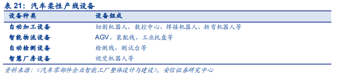 汽车电子元件的多样化、个性化使得制造工艺更加复杂,有时需要在一条产线上批量生产多种型号的产品,这对生产线的柔性提出了更高的要求。具体来看,汽车行业的柔性产线主要包含自动加工设备、智能物流设备、自动检测设备、智慧厂房设备等,具体如下表所示: