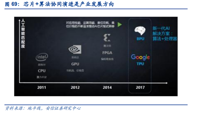 自动驾驶计算平台演进方向——芯片+算法协同设计。目前运用于自动驾驶的芯片架构主要有4种:CPU、GPU、FPGA(现场可编程门阵列)和ASIC(专用集成电路)。从单位功耗、应用性能、性价比、成本等多维度分析,我们相对更看好ASIC的发展情景。参考我们之前发布的行业报告《芯际争霸—人工智能芯片研发攻略》的观点,未来芯片有望迎来全新的设计模式——应用场景决定算法,算法定义芯片。