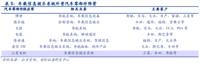 外资零部件巨头与电子企业引领全球市场。车载信息娱乐系统主要可分为零部件汽车和电子企业,前者包括博世、德尔福、大陆、电装、主要优势在于凭借其他零部件业务与整车厂的联系更为密切,后者主要优势在于产业链整合能力,目前全球车载信息娱乐系统的市场空间主要被二者占据。