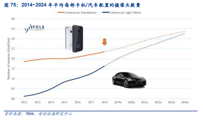 摄像头能够在有光情况下采集周围环境信息,通过图像识别技术,使得汽车能够自主判断人、车、物等关键信息。Yole预计,到2024年平均每台汽车拥有3颗摄像头。汽车摄像头结构智能手机类似,均包含CMOS图像传感器、镜头、马达、柔性电路板等主要器件,产业链相对趋同。Yole预计全球摄像头模组产业链市场空间有望在2024年达到450亿美金,其中汽车摄像头市场超过50亿美金。