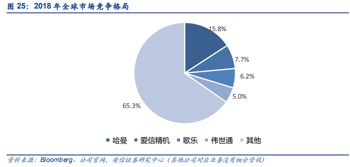 从全球竞争格局来看,根据公司年报,哈曼、爱信精机、歌乐、伟世通的车载信息娱乐系统营收分别为31.0、15.1、12.1、9.8亿美元,对应196美元的市场空间,则市占率分别为15.8%、7.7%、6.2%、5.0%,其余巨头的车载信息娱乐系统业务无细分营收数据。