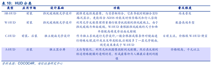 HUD主要分成四种,分别是AR-HUD(AugmentedReality-HUD即:增强现实抬头显示器)、W-HUD(windshield-HUD)、C-HUD(CombinerHUD)、A-HUD(AftermarketHUD),目前主流的HUD主要为W-HUD、C-HUD。