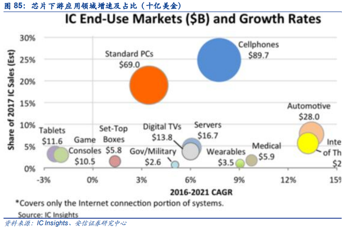 随着汽车电子进一步向电子化、智能化发展,汽车电子技术要求越来越高。未来处理器、计算能力将成为评价汽车性能的重要指标。尤其是自动驾驶、车联网的发展将使车用芯片成为未来汽车电子产业的核心。未来汽车半导体市场将为各大厂商提供一个高速成长的蓝海市场,根据ICInsights数据指出,汽车是复合增速最快的应用领域。
