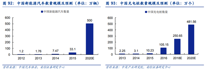 根据strategicanalysis数据,随着汽车电动化程度的提升,汽车半导体ASP预计由475美金提升至750美金。轻混电动车半导体价值量为475美金,插电混合电动车半导体价值量为740美金,纯电动汽车半导体价值量为750美金(取消ICE,功率器件价值量有75美金提升至455美金)。单辆汽车的功率转换系统主要有:(1)车载充电机(chargeronboard),(2)DC/AC系统,给汽车空调系统、车灯系统供电,(3)DC/DC转换器(300v到14v的转换),给车载小功率电子设备供电,(4)DC/DCconverter(300v转换为650v),(5)DC/AC逆变器,给汽车马达电机供电。(6)汽车发电机新能源汽车市场崛起,成IGBT行业较强催化剂。根据国家发改委印发的《电动汽车充电基础设施发展指南(2015-2020)》,到2020年国内充换电站数量将达到1.2万个,分散式充电桩超过480万个,预计至2020年中国新能源汽车数量规模达500万辆。根据我们产业链调研,IGBT模块占到新能源汽车动力电控系统成本的30%,整流模块占到直流充电桩成本的20%,预计新能源车及充电桩市场崛起,可带动IGBT及整流模块的市场需求。
